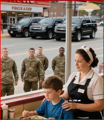 Despite the criticism and even online mockery, Jenny continued her quiet act of kindness, holding onto a journal entry from her late father—a military medic—who once wrote about sharing food with a hungry child and how no one ever becomes poorer by giving. Then, after several weeks, the boy stopped coming. Jenny left pancakes on the empty table day after day, but he never returned. The silence weighed heavily on her heart. Then, on the twenty-third day of his absence, four black SUVs pulled up outside the diner. Soldiers stepped inside, led by Colonel David Reeves of the U.S. Army Special Forces, who sought Jenny.